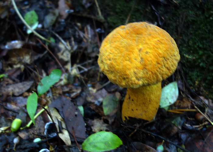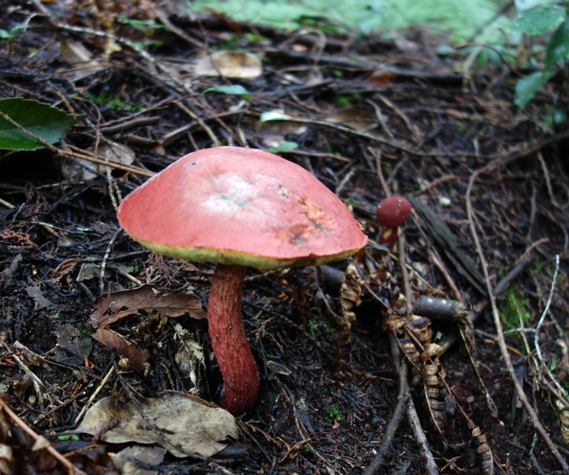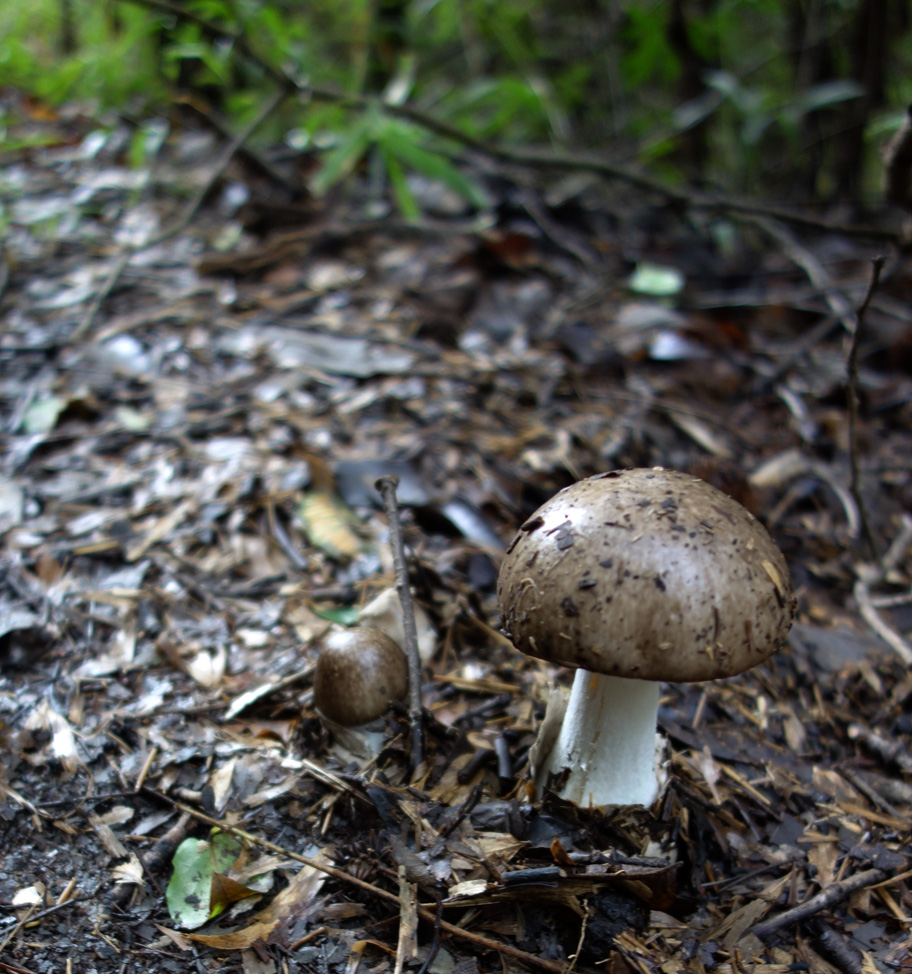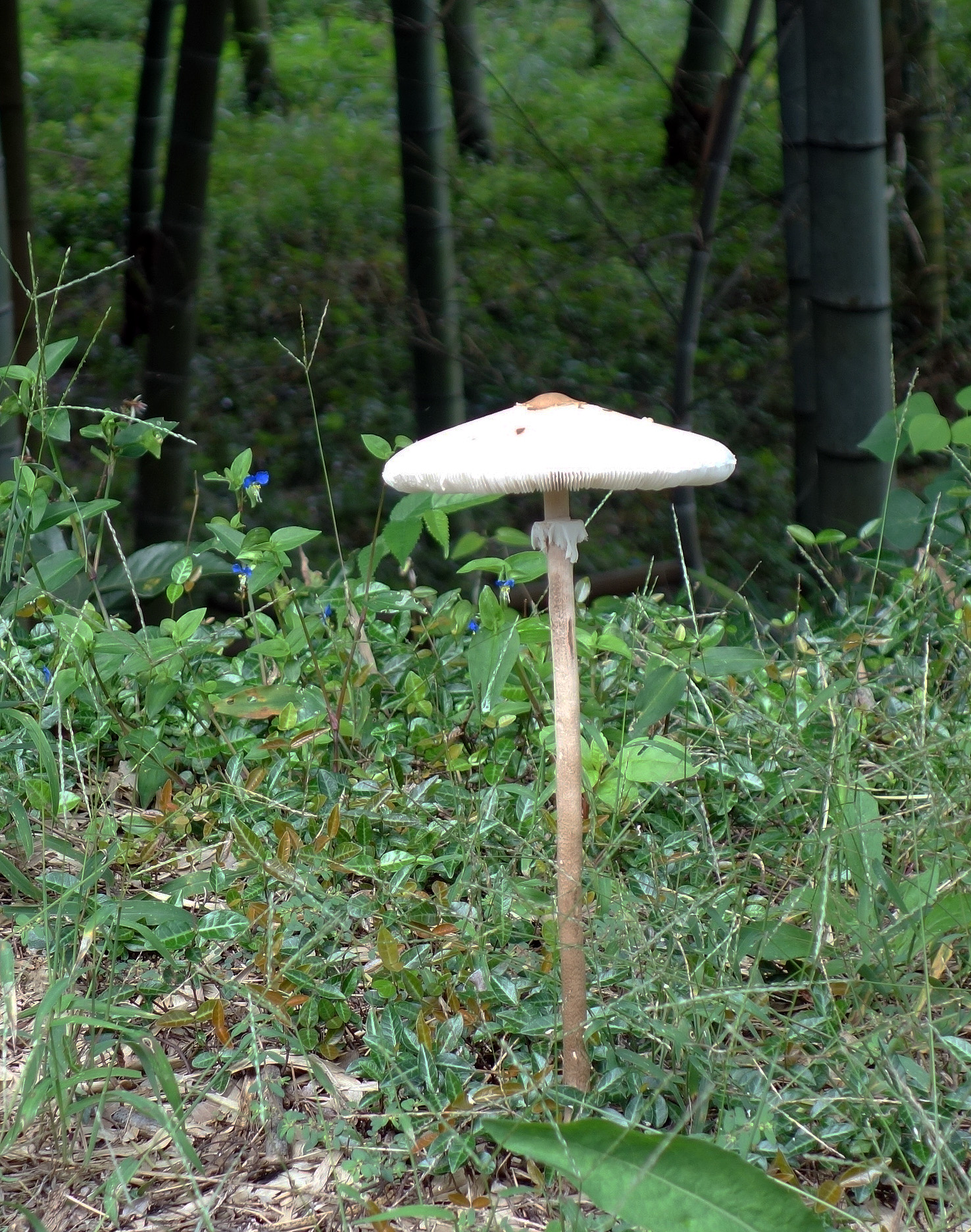 巨大キノコにも遭遇。高さが30センチ以上ありました。傘の部分も男性の片手を広げたくらいあります。後で調べたらマントカラカサタケというようです。