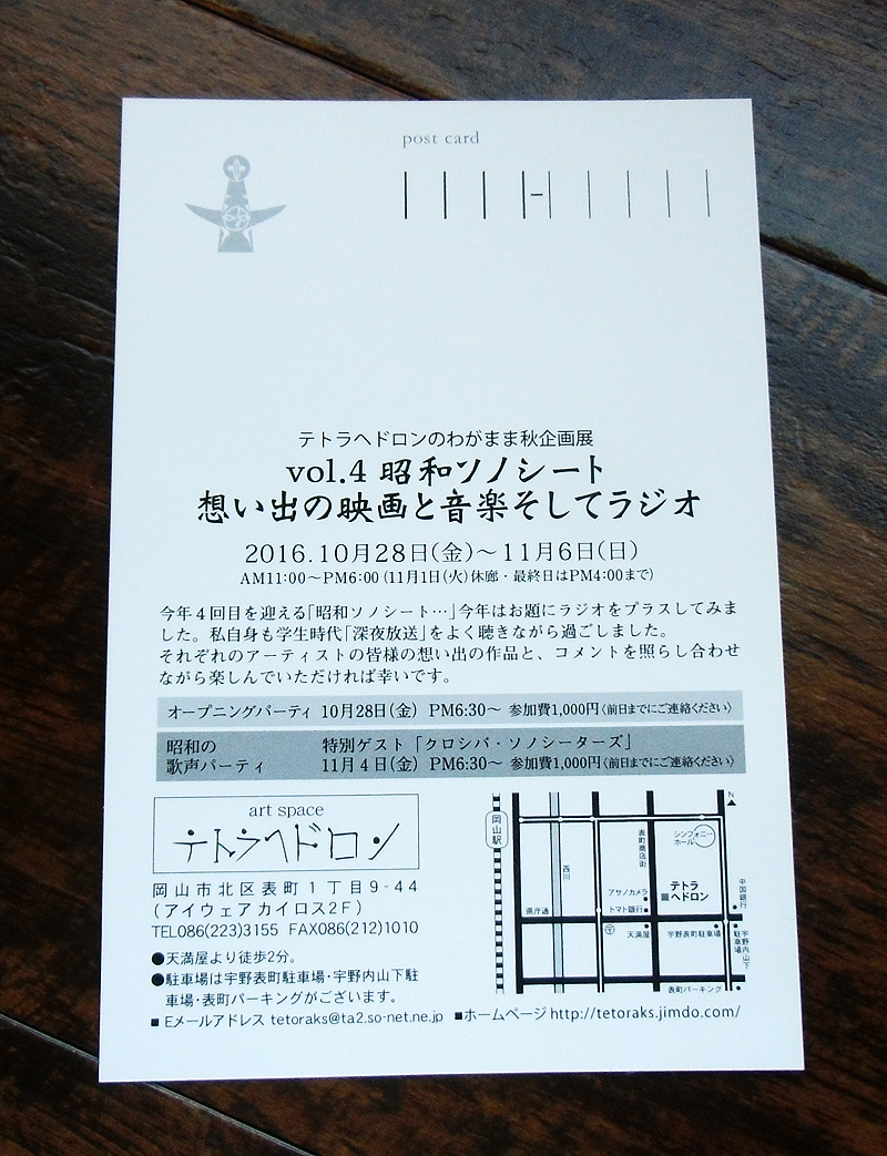 今月末から(2016.10/28~11/6)開催されるグループ展に、村田收と村田あけみも作品を出品します。岡山市内、表町にある『art spaceテトラヘドロン』というギャラリーでの開催です。