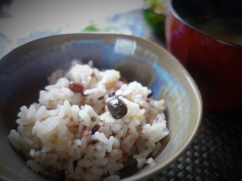 五穀米はいま、とても便利なミニパック(穀物や豆類がワンパックにされた)が色々出ています。それを白いお米を炊く時に加え炊くだけで、美味しい五穀米が手軽にいただける。少しだけ塩味をつけて頂きます。