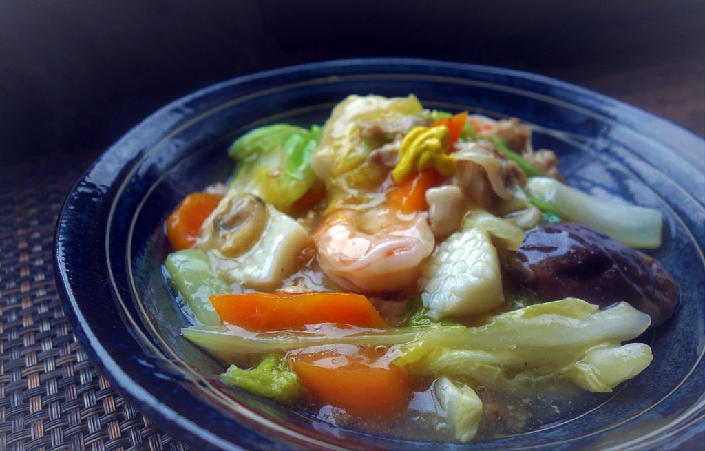 八宝菜には白菜と椎茸、ニンジン、玉ねぎ、ピーマン、海鮮(イカ、エビ、アサリ)豚肉の薄切りも入れてます。