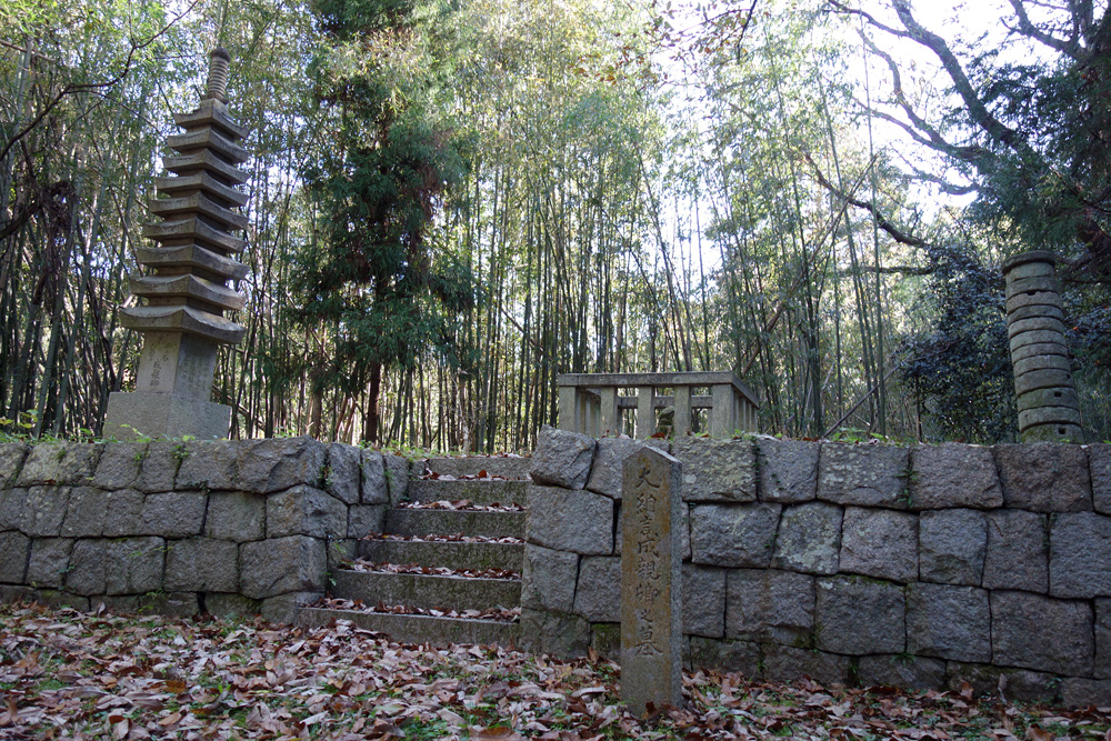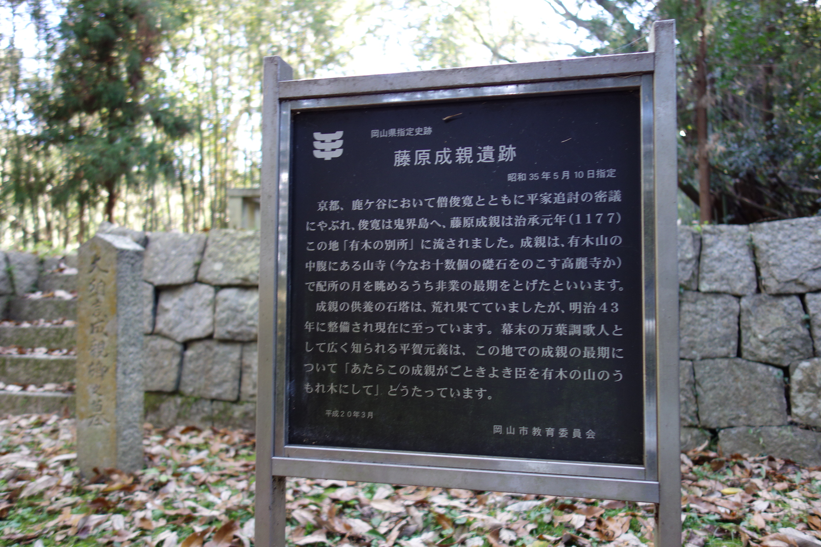 山道を登ると、藤原成親(ふじわらなりちか)の遺跡がありました。後白河院の側近で権大納言にまで上り詰めた人ですが、歌舞伎の演目にもなっている僧の俊寛と共に平家追討を企てたものの露見し、清盛の命により俊寛は鬼界ヶ島へ。一方、藤原成親は、備前(現在の児島辺りに)流され、その後、中山の有木で非業の死を遂げた(崖から突き落とされたとも、餓死させられたとも諸説ある)人物です。