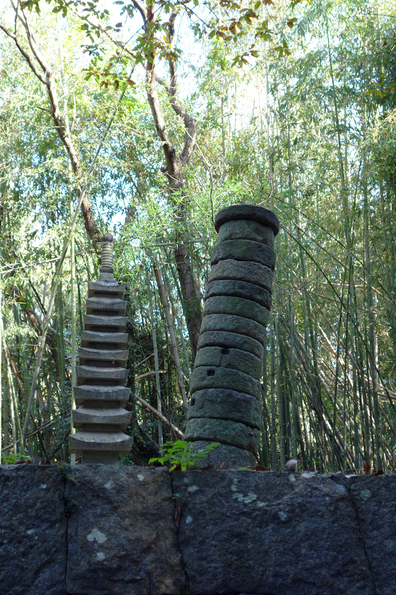 積まれた石塔が木漏れ日を浴びていました。