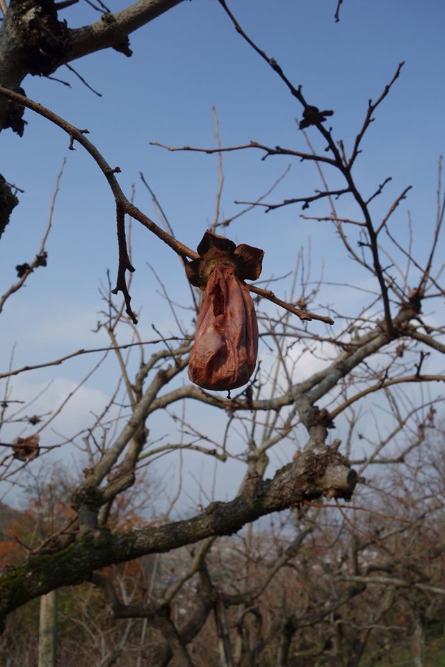 なんてコピーを添えてアップしたのですが、あれから一ヶ月半も過ぎた昨日(12月16日)のこと。以前と同じ場所にポツンとひとつ柿の残骸。