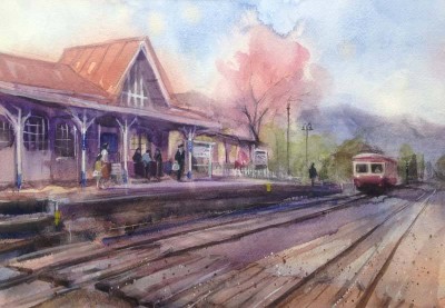 帰宅後、村田 收(osamu murata )が絵にしました。人物などを配置して当時の様子を再現。服装とかも昭和レトロな雰囲気にしています。では、駅で見かけた懐かしい風景もご紹介しましょう。