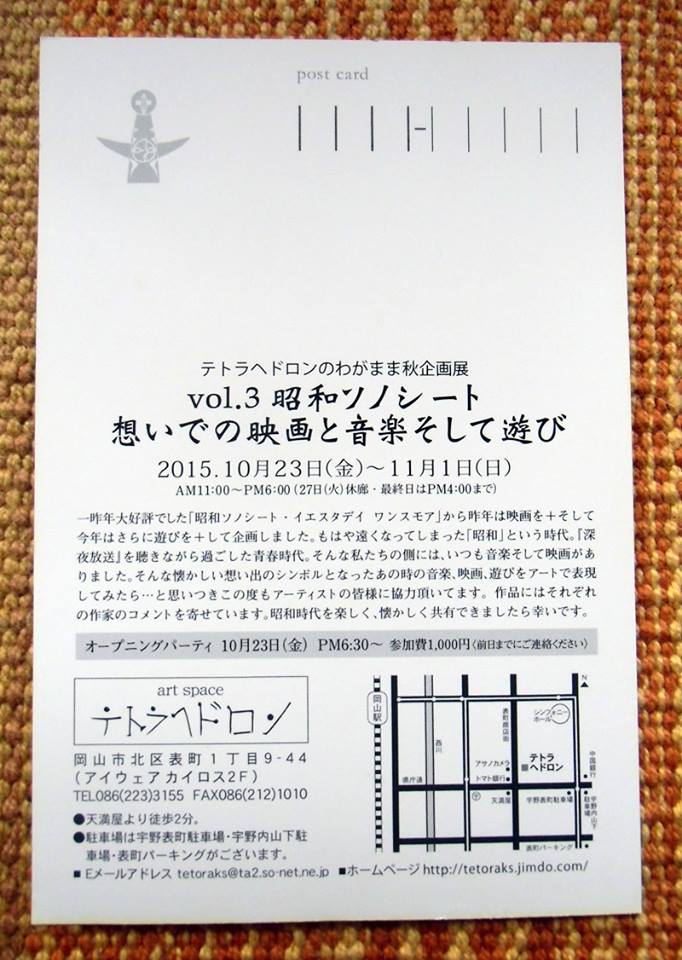 展示会情報 岡山テトラへドロンの 『昭和ソノシート』在廊日と時間について 2015年10月24日 あけみ コメントをどうぞ 明日からいよいよグループ展 『昭和ソノシート』が始まりますが、会期中 明日金曜日(23日)午後3時~6時と 日曜日(25日)午前11時~午後4時は ふたりで画廊にいる予定です。 それ以外の平日とかご希望の方いらしたら 遠慮なく声をかけて下さい。 では、お待ちしています~♪ ビヤはお留守番。