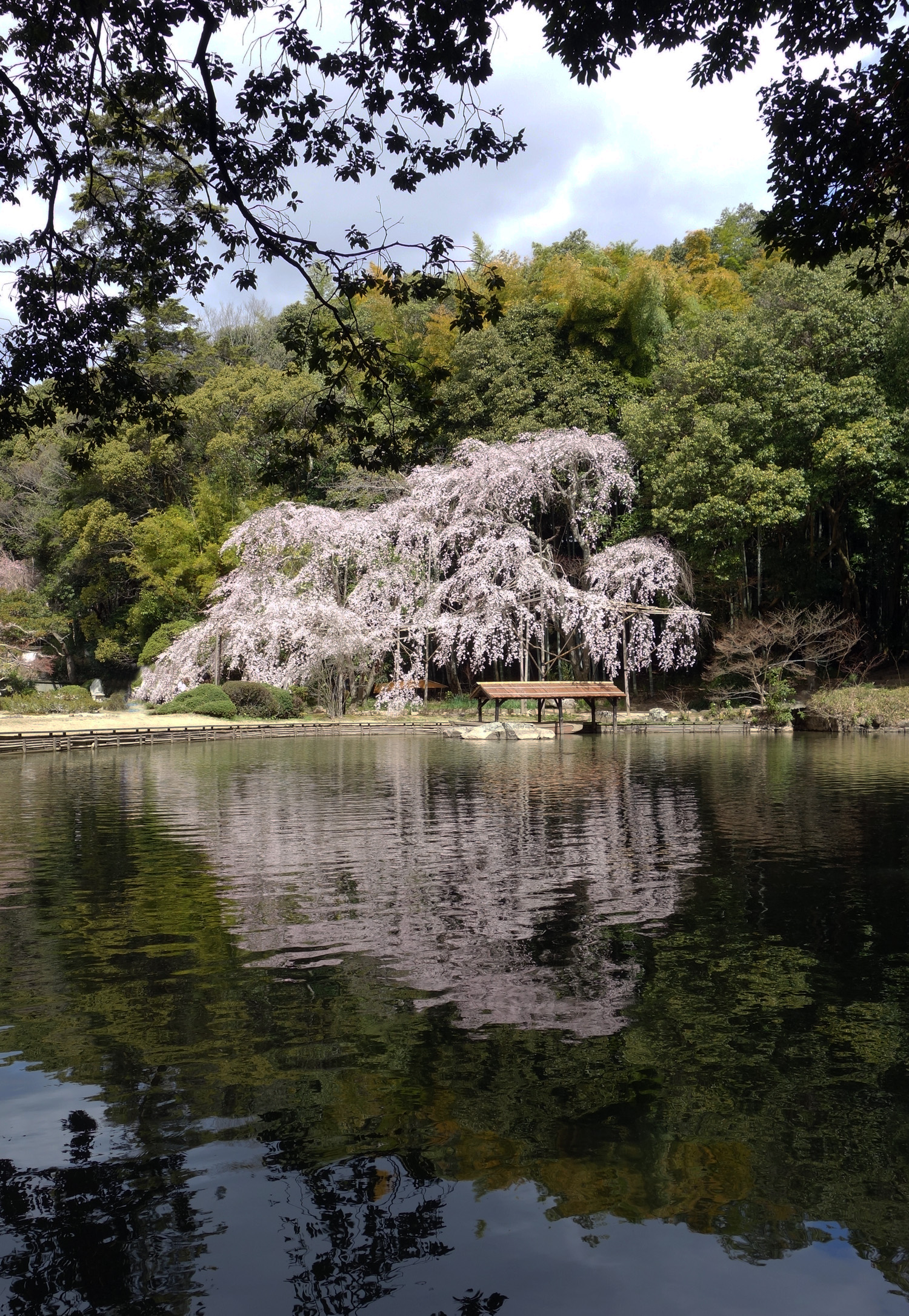 枝垂れ桜を水面に映す岸辺に立つと・・・