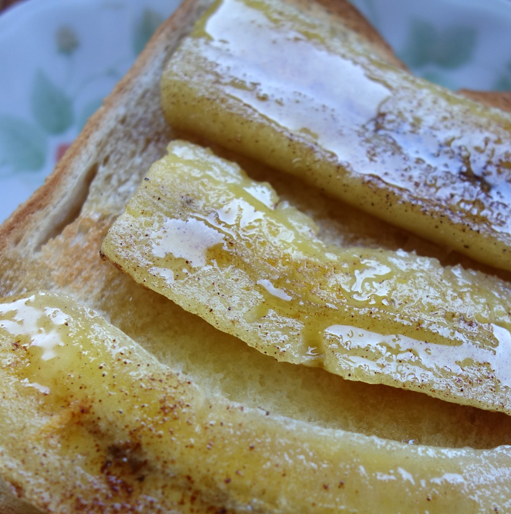 料理 焼バナナをトーストにのせて~♪ 2016年4月1日 あけみ コメントをどうぞ 焼きバナナ(あたためたフライパンにバターを溶かし、スライスしたバナナを並べて両面こんがり焼く)に、シナモン(粉末)をぱらっと振って、焼き上がったトーストに乗せるだけ。 いつものトーストもオシャレに変身☆ 上からメープルシロップをかけていただきます~♪メイプルシロップのかわりにハチミツでもいいですよ。 ふりかけるシナモン(香辛料)は、リンゴを煮たり、インド風の紅茶(チャイ)を作る時にも重宝します。粉状を小さな瓶詰めで売っていますので常備しておくと何かと重宝します。